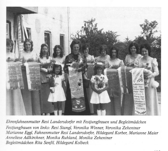 Nach der Gefallenenehrung zogen die Vereine zum gemeinsamen Mittagsmahl zum Festzelt nach Viecht, von wo aus am frühen Nachmittag der Festzug der teilnehmenden Kameradschaften durch die Gemeinde zog. Anschließend zierten die Festjungfrauen die Fahnen der Vereine mit dem Erinnerungsband des Veteranen- und Kriegervereins Eching.