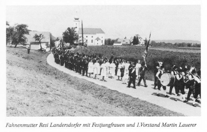 Den Höhepunkt der kirchlichen Feier bildete anschließend die Weihe der schmucken Fahne durch H. H. Pfarrer Brandl. Bevor man wieder zum Gasthaus Schreff nach Viecht zurückmarschierte, hielt der Pfarrherr an der Gefallenengedächnisstätte ein feierliches Requiem, dem sich ehrende Prologe der Festjungfrauen anschlossen. Als Abschluß der Gefallenenehrung legte Vorstand Martin Lauerer im Namen der Vereine einen schmucken Kranz am Kriegerdenkmal nieder. - Unter den Festgästen begrüßte er dann neben den bereits genannten auch Graf und Gräfin von Soden sowie Graf Medem.