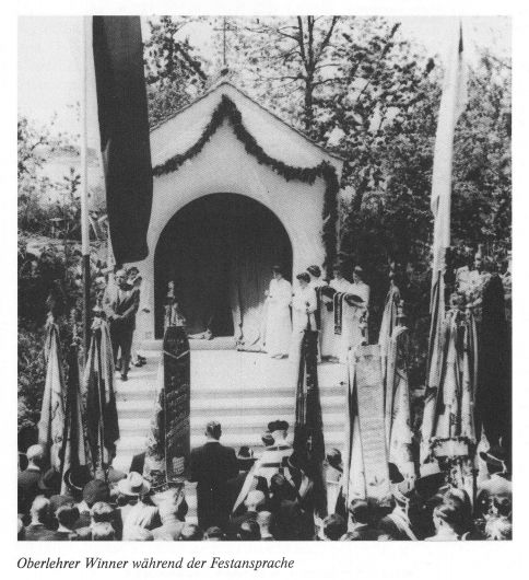 Mit Flieder und frischem Grün hatte man die Umgebung des Denkmals geziert, als sich die zahlreichen Festgäste zur feierlichen Einweihung einfanden.