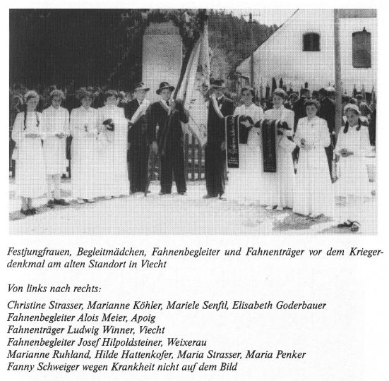 Nach diesem Gedenkakt formierten sich die Teilnehmer zu einem Zug, der zum alten Kriegerdenkmal an der Bundesstraße 11 führte. Dem Burschenverein Eching folgten die Feuerwehren von Ast, Eching, Berghofen, Kronwinkl, Tiefenbach, Viecht. Die fünf Gemeinden wurden durch ihre Bürgermeister vertreten. Festjungfrauen waren: Marianne Ruhland, Hilde Hattenkofer, Mariele Senftl, Elisabeth Goderbauer, Maria Strasser. Ihnen schlossen sich im Zug die Kriegervereine aus folgenden Ortschaften an: Eching, Ast, Moosburg, Buch, Pfrombach, Burgharting, Gammelsdorf, Vilsheim, Hörgertshausen, Kriegerkameradschaft Landshut 1841, Tiefenbach, Langenpreising, Volkmannsdorf, Gramelkam, Münchnerau, Weihmichl, Altdorf, Gündlkofen, Zweikirchen, Ergolding, Neuhausen, Altfraunhofen, Obergangkofen.