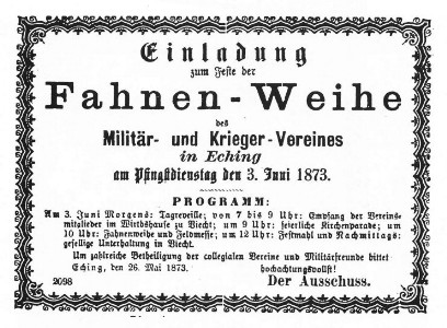 Am 3. Juni feierte der Krieger- und Veteranenverein von Eching und Umgebung das jährliche Vereinsfest mit Fahnenweihe. Etwas vor 10 Uhr marschierte ein stattlicher Zug von 200 Mann im Festtags- und Ehrenschmuck vom Gasthause zu Viecht, als Sammelpunkt, zur Pfarrkirche Eching, um das Fest mit Gottesdienst zu beginnen. Nach der Fahnenweihe und der Festmesse ging es wiederum unter klingendem Spiele dem obbemeldeten Ausgangspunkte zu, allwo in der fröhlichsten und heitersten Stimmung das frugale Festmahl eingenommen wurde.