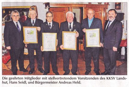 In Vertretung der Vorstandschaft des KKSV Landshut überreichte Hans Seidl dem Fähnrich Johann Mayer aus Berghofen eine Ehrenurkunde mit Ehrenabzeichen und Ehrennadel für 30-jährige Tätigkeit in der Vorstandschaft. Er ist bereits seit 1984 aktiv als Fahnenträger tätig. Dem Kameraden Richard Baumgartner wurde dieselbe Ehre zuteil. Er war seit 1986 im Ausschuss tätig, war ab 1987 Schriftführer und ist seit 1995 Vorsitzender des Vereins.