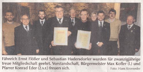 Im Anschluss wurde Fähnrich Ernst Flößer und Sebastian Hadersdorfer für zwanzigjährige Mitgliedschaft geehrt.